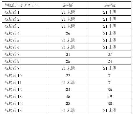 報告の臨床試験時、ミオグロビンが検出限界以下である者が散見されたこと、および検出限界以上の者も施術による大幅な変動は認められなかった。